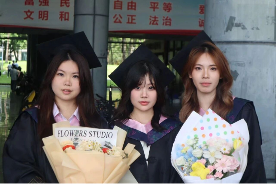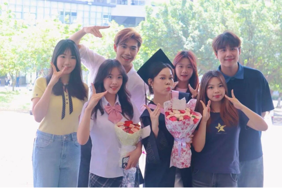 自由拍摄时间,有的班级和老师围坐在一起,拍下充满温情的师生合照;有的同学和好友捧着鲜花,在镜头前定格双人合影;还有的同学拿着定制的毕业应援扇和应援海报,和好友一起记录下在校园里学习的最后一个春日。图书馆广场前,相机的快门声、同学们的笑声与风穿过树叶的沙沙声交织,成了毕业季最动听的背景音。