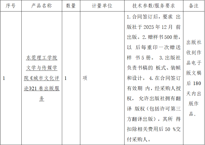 1 | 太阳城娱乐《城市文化评论》21卷出版服务 | 1 | 项 | 1.合同签订后,要求 出版社于2025年12月 前出版。 2.赠样书500册,以 后每重印一次赠送样 书5册。 3.出版社负责书稿的 板式、装帧和设计。 4.在合同签订有效期 内,经采购人授权, 允许出版社拥有翻译 版权(包括许可第三 方翻译出版),其所 得扣除相关费用后50 %交付采购人。 |